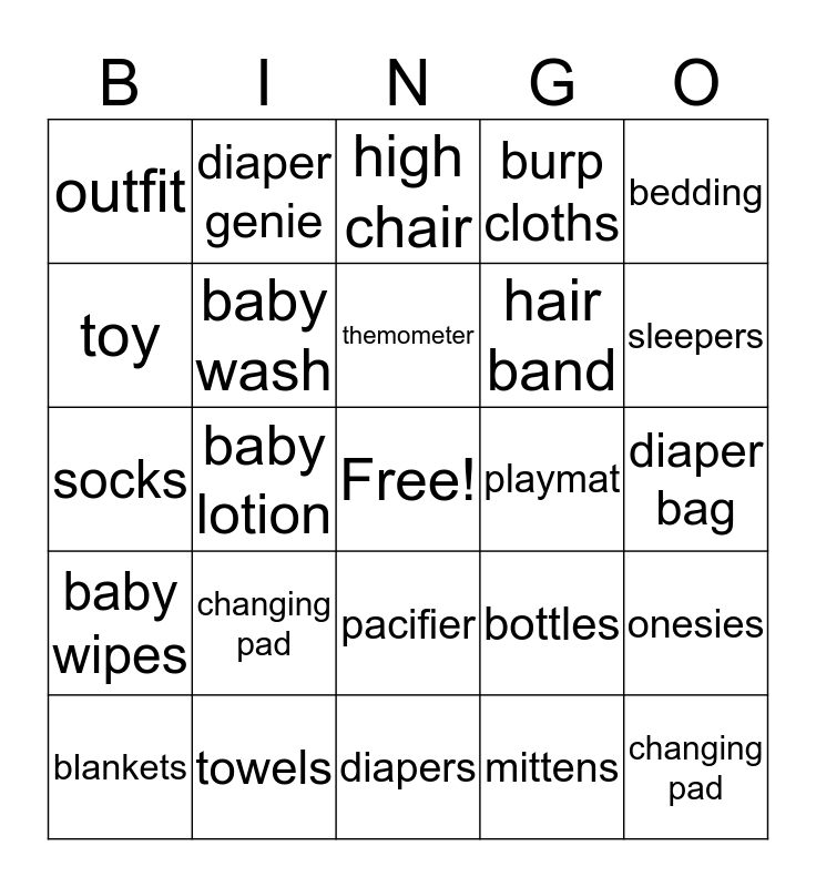 This bingo card has a free space and 24 words: changing pad, towels, themometer, blankets, bedding, outfit, toy, diaper genie, playmat, pacifier, hair band, socks, bottles, onesies, baby wash, mittens, diaper bag, high chair, sleepers, baby lotion, changing pad, baby wipes, burp cloths and diapers.
