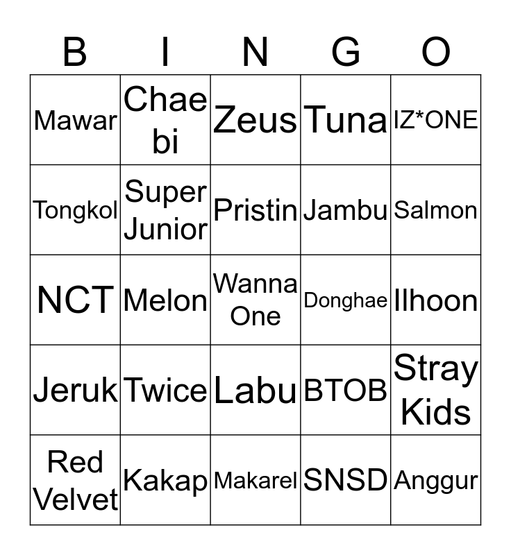 This bingo card has a free space and 24 words: Red Velvet, Twice, Pristin, SNSD, IZ*ONE, Mawar, Chae bi, Zeus, Donghae, Ilhoon, NCT, Super Junior, BTOB, Stray Kids, Tongkol, Kakap, Makarel, Tuna, Salmon, Jeruk, Melon, Labu, Jambu and Anggur.