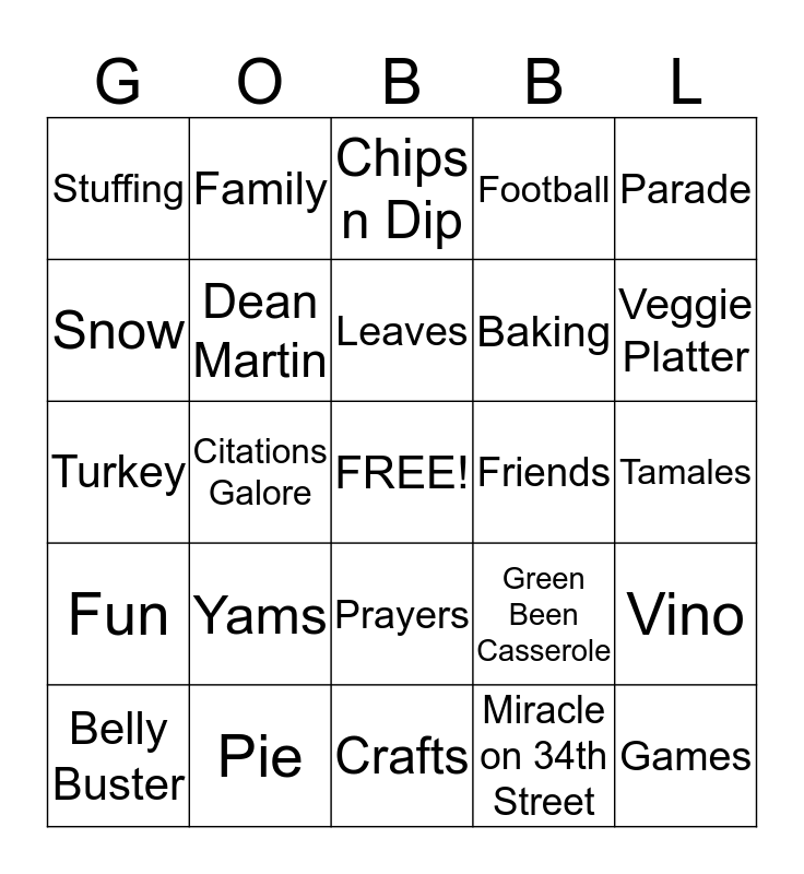 This bingo card has a free space and 24 words: Yams, Pie, Leaves, Belly Buster, Parade, Stuffing, Snow, Family, Friends, Prayers, Baking, Turkey, Green Been Casserole, Vino, Dean Martin, Miracle on 34th Street, Tamales, Chips n Dip, Veggie Platter, Citations Galore, Games, Fun, Football and Crafts.
