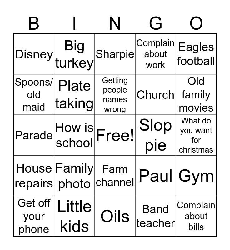 This bingo card has a free space and 39 words: Camera smile, Cracker pudding, Joe's shirt, Plate taking, Get off your phone, Farm channel, Getting people names wrong, Singing/ humming, Eagles football, House repairs, How is school, Complain about work, Complain about bills, What do you want for christmas, Slop pie, Family photo, Comments about outfits, Disney, Kara/zanny baby, Paul, Spoons/ old maid, Oils, Church, Old family movies, Spoiling twd, Black Friday ads, Emma eating off floor, Sell online?, Scott jokes, Big turkey, Giant stories, Snow, Sharpie, Little kids, Band teacher, Deviled eggs, Gym, Parade and College.