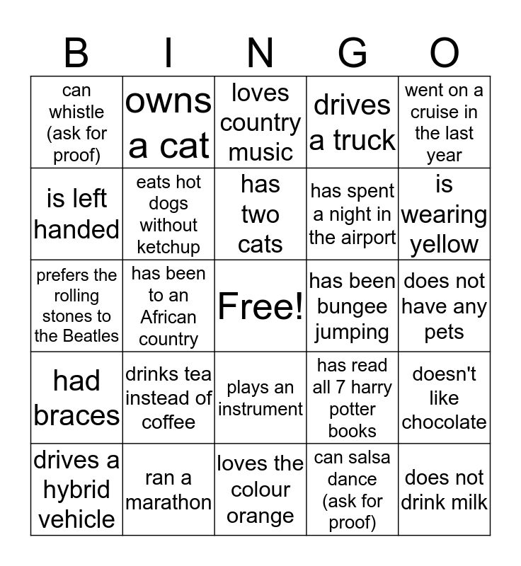 This bingo card has a free space and 25 words: drinks tea instead of coffee, loves the colour orange, has two cats, drives a hybrid vehicle, went on a cruise in the last year, can whistle (ask for proof), is left handed, owns a cat, has been bungee jumping, plays an instrument, has spent a night in the airport, prefers the rolling stones to the Beatles, has read all 7 harry potter books, doesn't like chocolate, eats hot dogs without ketchup, has been on a blind date, does not have any pets, loves country music, is wearing yellow, has been to an African country, does not drink milk, ran a marathon, had braces, drives a truck and can salsa dance (ask for proof).