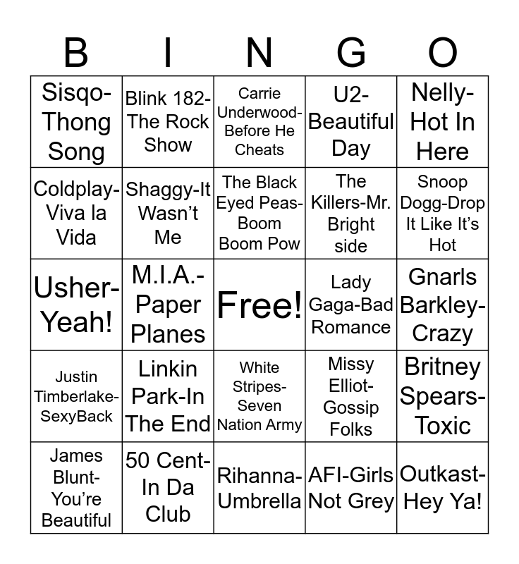 This bingo card has a free space and 29 words: James Blunt-You’re Beautiful, Ok Go-Here It Goes Again, M.I.A.-Paper Planes, Fountains of Wayne-Stacy’s Mom, Sisqo-Thong Song, Carrie Underwood-Before He Cheats, Shaggy-It Wasn’t Me, Linkin Park-In The End, Lady Gaga-Bad Romance, 50 Cent-In Da Club, Gnarls Barkley-Crazy, Outkast-Hey Ya!, Rihanna-Umbrella, AFI-Girls Not Grey, Snoop Dogg-Drop It Like It’s Hot, Eminem-Lose Yourself, White Stripes-Seven Nation Army, Justin Timberlake-SexyBack, Nelly-Hot In Here, Usher-Yeah!, Missy Elliot-Gossip Folks, Feist-1,2,3,4, The Killers-Mr. Bright side, Coldplay-Viva la Vida, U2-Beautiful Day, Blink 182-The Rock Show, Britney Spears-Toxic, The Black Eyed Peas-Boom Boom Pow and Lifehouse-Hanging by a Moment.