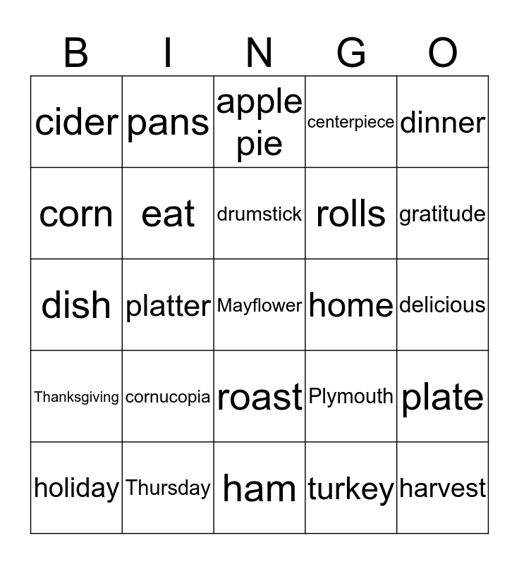 This bingo card has 80 words: Free!, America, apple pie, autumn, bake, baste, blessings, bread, FREE, carve, casserole, celebrate, centerpiece, cider, cook, corn, cornbread, cornucopia, cranberries, delicious, dessert, dinner, dish, drumstick, eat, fall, family, feast, giblets, gobble, gratitude, gravy, ham, harvest, holiday, home, leftovers, maize, Massachusetts, Mayflower, nap, native, New World, November, oven, pans, parade, pecan pie, pie, Pilgrims, plate, platter, Plymouth, pots, prayer, pumpkin, pumpkin pie, Puritans, recipe, roast, rolls, sauce, serve, sleep, snow, squash, stir, stuffing, tablecloth, thanks, Thanksgiving, Thursday, tradition, travel, tray, treaty, turkey, vegetables, wishbone and yams.