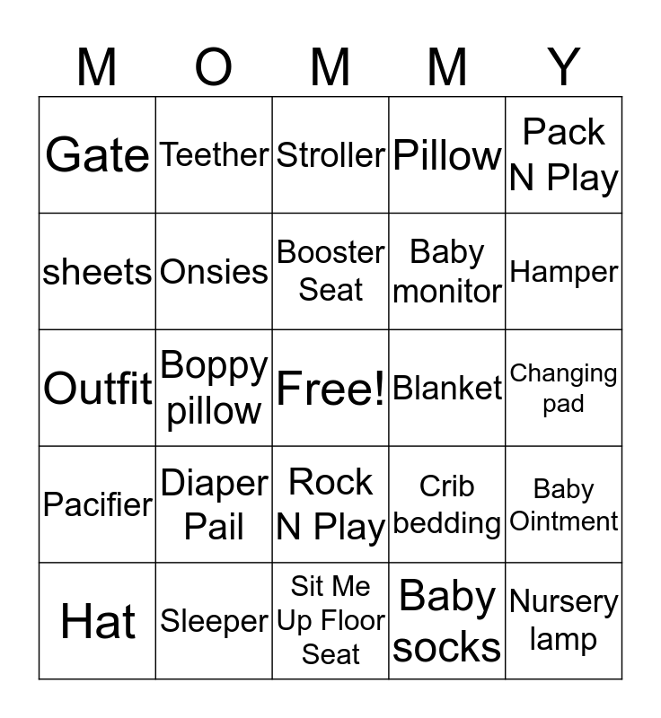 This bingo card has a free space and 39 words: Car Seat, Baby Carrier, Baby Monitor, Onsies, Hat, Rock N Play, Booster Seat, High Chair, Pack N Play, Pacifier, Boppy pillow, Pillow, Nursery lamp, Changing pad, Blanket, Diaper Pail, Hooded Towel, Gate, Mobile, Crib bedding, sheets, Sit Me Up Floor Seat, Baby monitor, Hamper, Bibs, Diapers, Baby Wipes, Baby Shampoo, Baby Soap, Teether, Photo album, Washcloths, Stroller, Sleeper, Baby socks, Swaddlers, Baby Ointment, Outfit and socks.