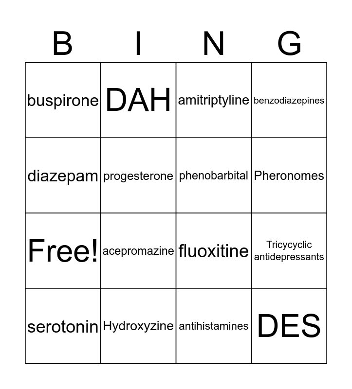 This bingo card has 20 words: Tricycyclic antidepressants, limbic system, amitriptyline, MAOI, serotonin, diazepam, Hydroxyzine, buspirone, Free!, DAH, acepromazine, fluoxitine, progesterone, DES, phenobarbital, SSRI, Pheronomes, benzodiazepines, antihistamines and anticonvulsants.
