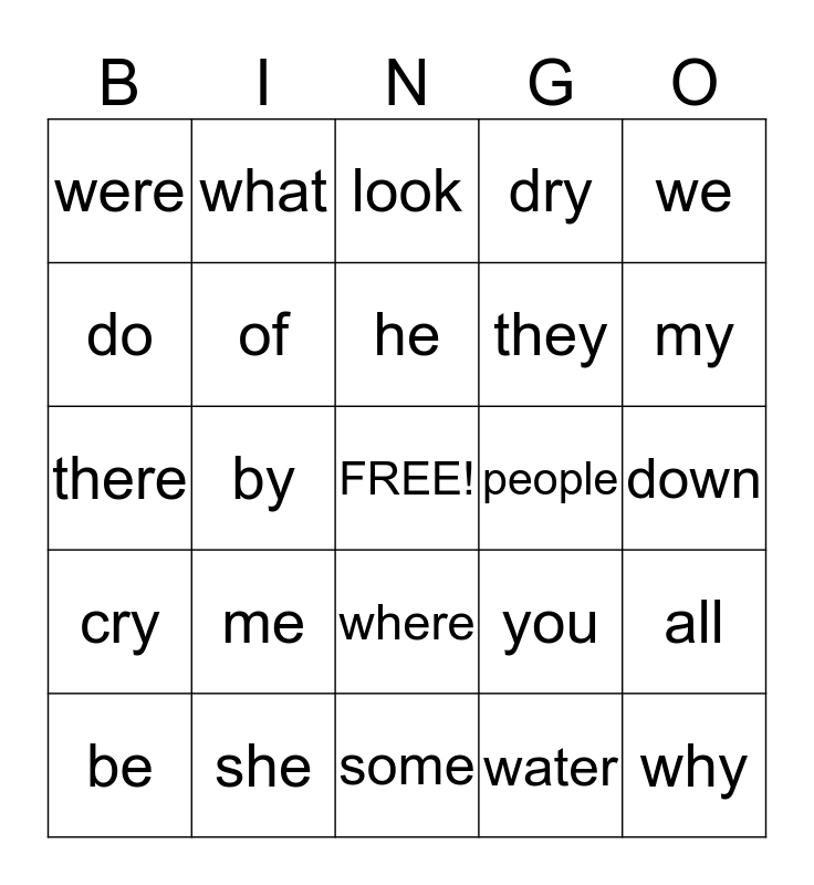 This bingo card has a free space and 24 words: me, she, he, be, we, were, do, what, people, where, they, there, you, all, of, water, down, look, my, by, why, cry, dry and some.