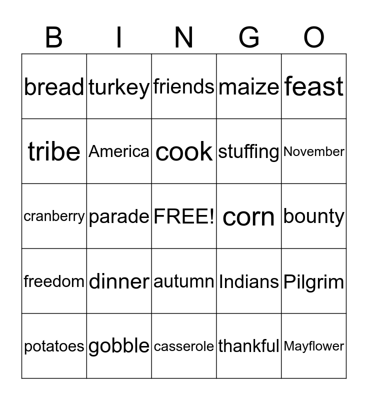 This bingo card has a free space and 32 words: thankful, eat, parade, tradition, freedom, America, feast, Pilgrim, turkey, harvest, cook, friends, yams, pie, corn, gravy, potatoes, cranberry, autumn, dinner, Indians, pumpkin, bounty, gobble, Mayflower, maize, stuffing, tribe, bread, casserole, cornucopia and November.