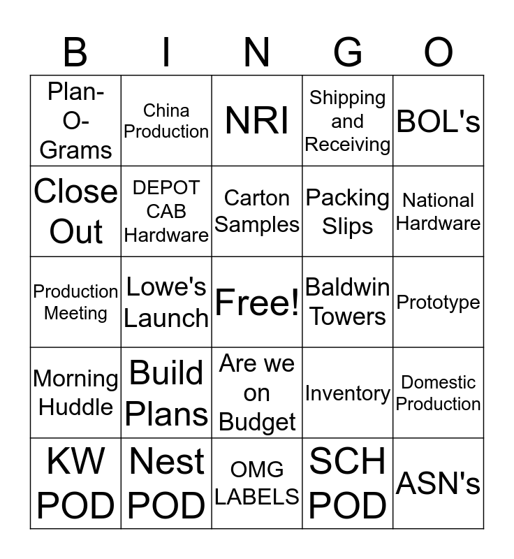 This bingo card has a free space and 29 words: KW POD, True Value Boards, Lowe's Launch, Delaney Towers, Plan-O- Grams, NRI, DEPOT CAB Hardware, Build Plans, Baldwin Towers, Nest POD, Prototype, ASN's, OMG LABELS, SCH POD, National Hardware, Prime Source, Are we on Budget, Morning Huddle, BOL's, Production Meeting, Inventory, Concepts, Packing Slips, Close Out, Shipping and Receiving, China Production, Domestic Production, Carton Samples and Graphics.
