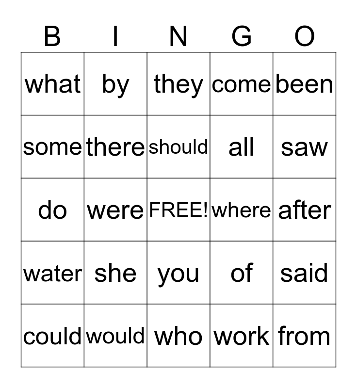 This bingo card has a free space and 24 words: she, would, should, could, been, what, some, by, where, you, all, do, of, said, there, work, after, they, saw, were, from, water, come and who.