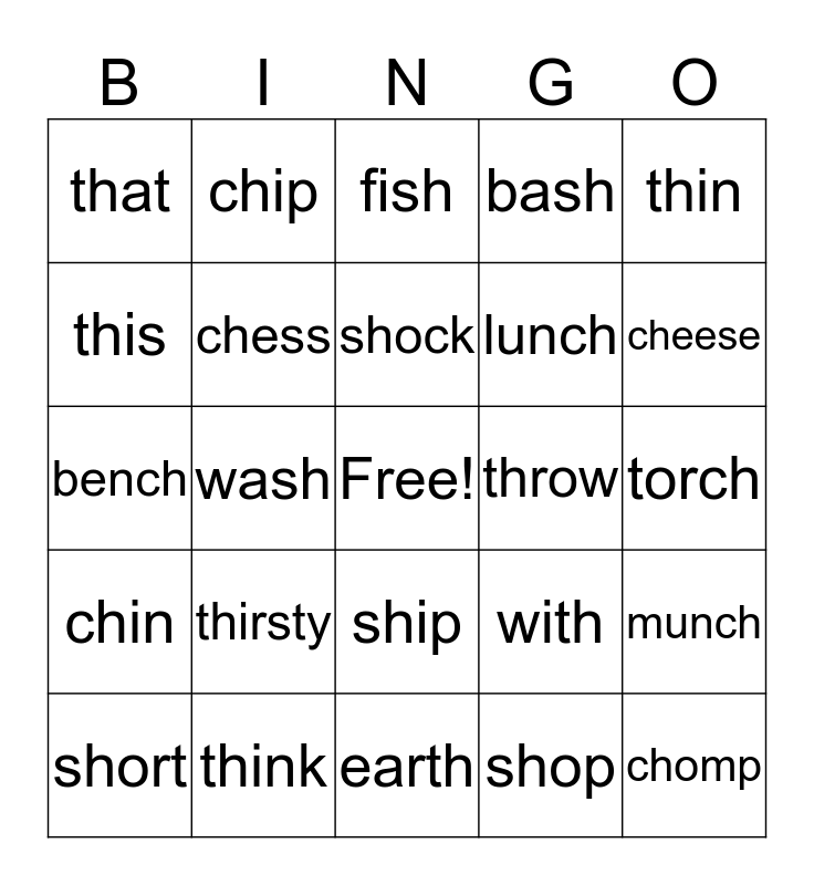 This bingo card has a free space and 26 words: ship, shop, shock, think, thin, that, this, chip, torch, with, lunch, bench, munch, short, wash, wish, bash, chin, fish, chomp, cheese, earth, throw, thirsty, chess and sheep.