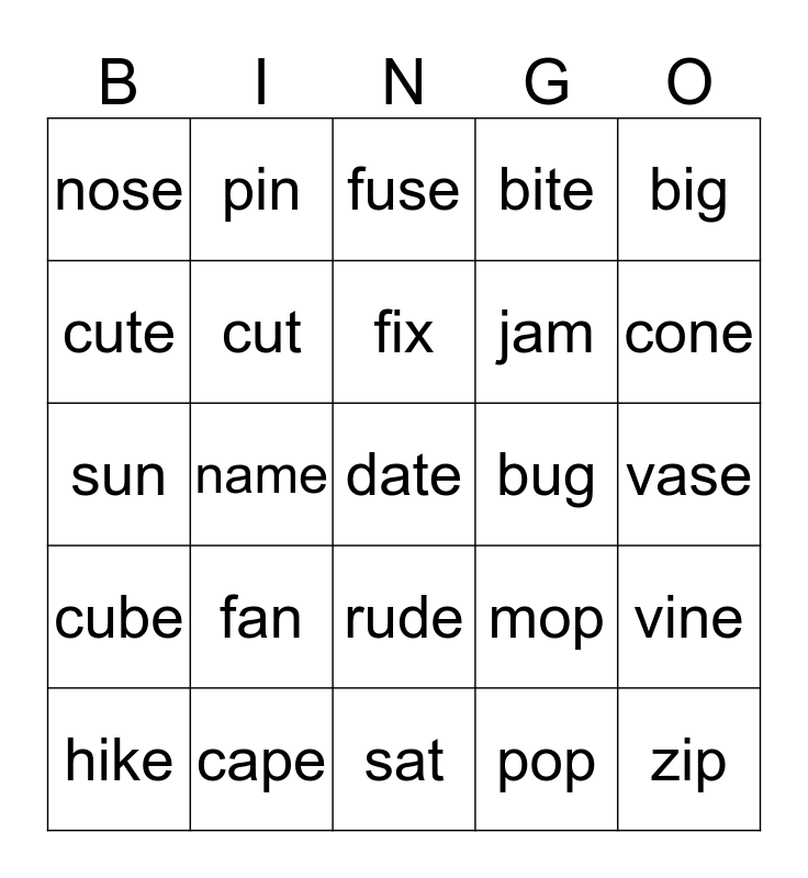 This bingo card has 25 words: cube, cape, date, pop, big, nose, pin, fuse, bug, vine, cute, cut, sat, mop, cone, hike, name, fix, jam, vase, sun, fan, rude, bite and zip.