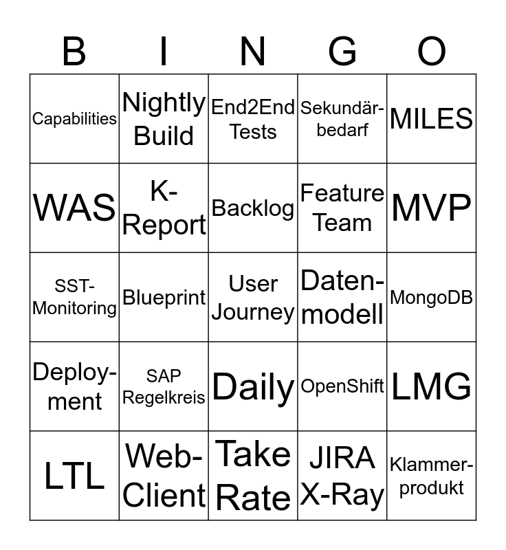 This bingo card has a free space and 29 words: LTL, Agile, Blueprint, Vogel-prespektive, Capabilities, End2End Tests, K-Report, SAP Regelkreis, Daten-modell, Web-Client, MongoDB, Klammer-produkt, Take Rate, JIRA X-Ray, MVP, Primär-bedarf, Daily, Deploy-ment, MILES, SST-Monitoring, OpenShift, Pack-vorschrift, Feature Team, WAS, Sekundär-bedarf, Nightly Build, LMG, Backlog and WIE.