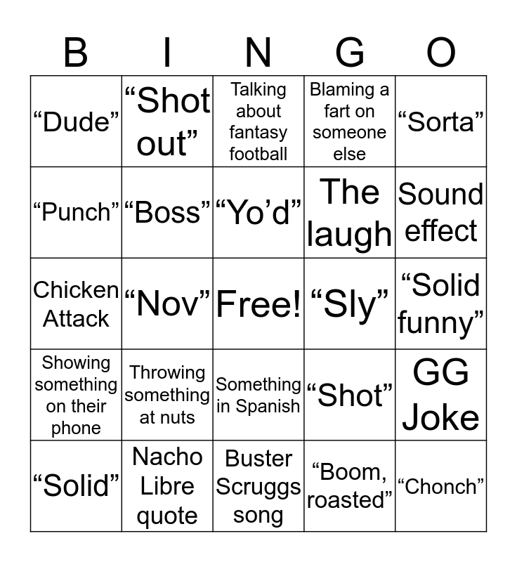 This bingo card has a free space and 27 words: “Shot”, Fart, The laugh, Buster Scruggs song, “Punch”, Talking about fantasy football, “Shot out”, Showing something on their phone, “Sly”, GG Joke, Chicken Attack, Blaming a fart on someone else, “Solid”, Nacho Libre quote, Sound effect, “Pinch”, “Boss”, “Yo’d”, Throwing something at nuts, “Dude”, “Solid funny”, “Boom, roasted”, “Nov”, “Chonch”, Something in Spanish, “Sorta” and “Roost”.