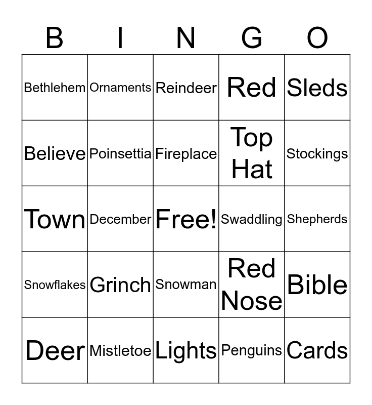 This bingo card has a free space and 97 words: Christmas, Holiday, Tree, December, 25, Jesus, Baby, Stable, Wisemen, Angels, Sheep, Star, Songs, Snowflakes, Camel, Bethlehem, Sleds, Gold, Frankincense, Myrrh, East, Toys, Mary, Joseph, Family, Fireplace, Deer, Bible, Programs, Twinkle, Poinsettia, Red, Donkey, Cross, Lights, Snowman, Mittens, Scarf, Caps, Town, Cows, Shepherds, Carrots, Penguins, Grinch, Bells, Advent, Candles, Organ, Peace, Lamb, Israel, Emmanuel, Fudge, Cookies, Evergreen, Garland, Ornaments, Campfire, Joy, Manger, Santa, Elves, Luke, Season, Cardinals, Candy, Canes, Holly, Mistletoe, Top Hat, Snowplow, Mrs. Claus, Train, Purple, Pink, Dove, Nativity, Swaddling, Gifts, Love, Stockings, Chimney, Stuffers, Bows, Gift Wrap, Cards, Ribbon, Church, Green, Reindeer, Rudolph, Sleigh, Red Nose, Believe, Faith and Herald.