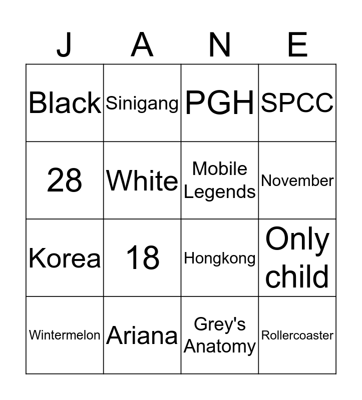 This bingo card has 25 words: Free!, Francis, November, 2000, 28, Black, White, Sinigang, Ariana, Singapore, Korea, Hongkong, Taiwan, Instagram, Mobile Legends, Koreanovela, Grey's Anatomy, PGH, 18, Only child, Wintermelon, 5'2, Rollercoaster, SPCC and SMACC.