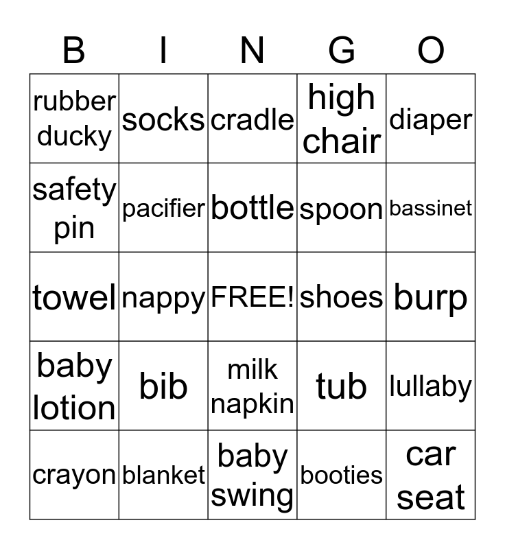 This bingo card has a free space and 24 words: bib, blanket, bottle, crayon, diaper, rubber ducky, safety pin, socks, shoes, milk napkin, spoon, towel, tub, lullaby, pacifier, booties, burp, cradle, bassinet, nappy, car seat, baby lotion, high chair and baby swing.