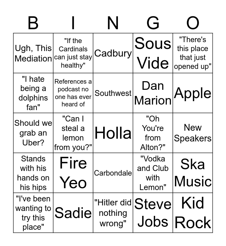This bingo card has a free space and 24 words: Fire Yeo, Sadie, Southwest, "I've been wanting to try this place", "There's this place that just opened up", Ugh, This Mediation, "I hate being a dolphins fan", "If the Cardinals can just stay healthy", "Oh You're from Alton?", Carbondale, Dan Marion, Should we grab an Uber?, "Vodka and Club with Lemon", Ska Music, References a podcast no one has ever heard of, Steve Jobs, New Speakers, Cadbury, Apple, "Can I steal a lemon from you?", Kid Rock, Stands with his hands on his hips, Sous Vide and "Hitler did nothing wrong".