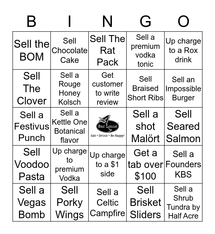 This bingo card has a free space and 24 words: Up charge to premium Vodka, Sell Porky Wings, Get customer to write review, Sell a Vegas Bomb, Up charge to a Rox drink, Sell the BOM, Sell The Clover, Sell Chocolate Cake, Sell a shot Malört, Up charge to a $1 side, Sell Braised Short Ribs, Sell a Festivus Punch, Get a tab over $100, Sell a Founders KBS, Sell a Rouge Honey Kolsch, Sell Brisket Sliders, Sell Seared Salmon, Sell The Rat Pack, Sell an Impossible Burger, Sell a Kettle One Botanical flavor, Sell a Shrub Tundra by Half Acre, Sell Voodoo Pasta, Sell a premium vodka tonic and Sell a Celtic Campfire.