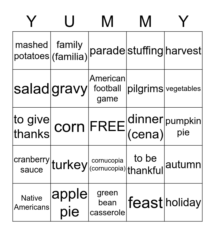 This bingo card has a free space and 24 words: turkey, apple pie, American football game, Native Americans, harvest, mashed potatoes, salad, family (familia), dinner (cena), cornucopia (cornucopia), pilgrims, to give thanks, to be thankful, autumn, gravy, feast, pumpkin pie, parade, vegetables, corn, holiday, cranberry sauce, stuffing and green bean casserole.