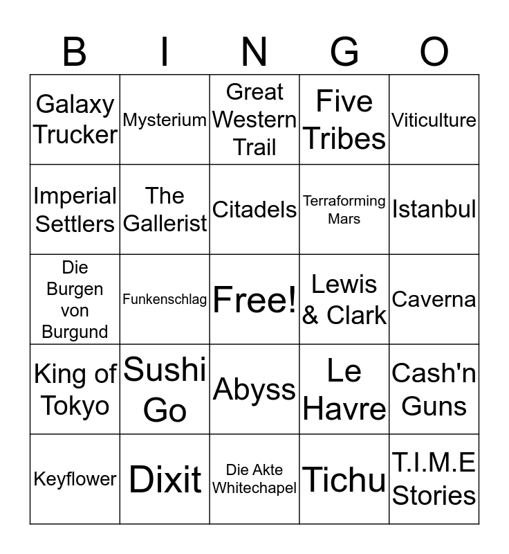 This bingo card has a free space and 89 words: 6 nimmt!, 7 Wonders, Abyss, Agricola, Aqua Sphere, Azul, Battlestar Galactica, Blood Rage, Bobbidi Boom, Bohnanza, Cacao, Carcassonne, Cash'n Guns, Caverna, Century, Citadels, Codenames, Coimbra, Concept, Concordia, Decrypto, Dice Forge, Die Akte Whitechapel, Die Alchemisten, Die Burgen von Burgund, Dixit, Dodelido, Dominion, Dungeon Lords, Ein Fest für Odin, Five Tribes, Funkenschlag, Gaia Project, Galaxy Trucker, Gobbit, Great Western Trail, Imperial Settlers, Isle of Skye, Istanbul, Keyflower, King of Tokyo, Kingdomino, Klong!, La Granja, Le Havre, Lewis & Clark, Lisboa, Mechs vs. Minions, Menara, Mysterium, Navegador, Newton, Nox, Oben und Unten, Orléans, Pandemie, Patchwork, Potion Explosion, Räuber der Nordsee, Robinson Crusoe, Roll for the Galaxy, Russian Railroads, Sagrada, Santorini, Scythe, Small World, Splendor, Star Realms, Stone Age, Sushi Go, T.I.M.E Stories, Targi, Terra Mystica, Terraforming Mars, The Gallerist, Tichu, Trajan, Trickerion, Tzolk'in, Village, Viticulture, Yokohama, Zug um Zug, Bandido, Ice Cool, Kamisado, Kill Dr. Lucky, Klask and Krasse Kacke.