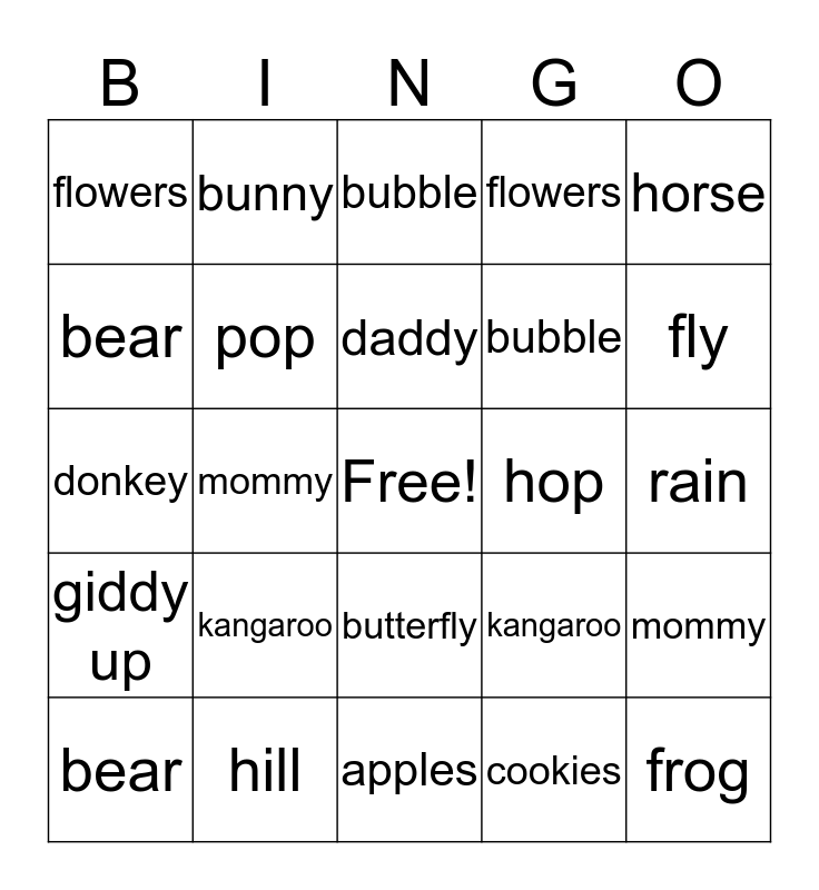 This bingo card has a free space and 29 words: bear, bunny, mommy, daddy, flowers, bubble, pop, kangaroo, hop, hill, rain, frog, apples, cookies, fly, bird, butterfly, giddy up, horse, donkey, kangaroo, whoa, bubble, bear, flowers, bunny, mommy, daddy and horse.