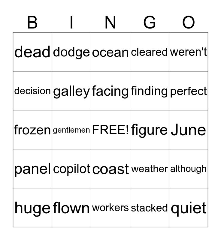This bingo card has a free space and 24 words: copilot, flown, facing, huge, weren't, dead, decision, dodge, figure, coast, finding, frozen, weather, although, galley, stacked, June, ocean, perfect, gentlemen, quiet, panel, cleared and workers.
