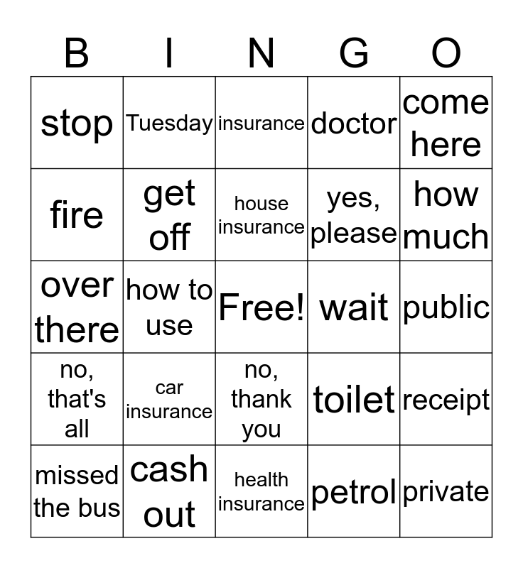 This bingo card has a free space and 29 words: missed the bus, checkout lady, how to use, don't move, stop, insurance, get off, car insurance, wait, cash out, public, private, health insurance, petrol, how much, anything else, no, thank you, no, that's all, come here, over there, toilet, police, yes, please, fire, doctor, Tuesday, receipt, house insurance and Brisbane.