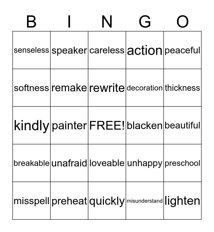 This bingo card has a free space and 24 words: unafraid, preheat, rewrite, misspell, peaceful, senseless, softness, speaker, blacken, loveable, decoration, kindly, unhappy, preschool, remake, misunderstand, beautiful, careless, thickness, painter, lighten, breakable, action and quickly.