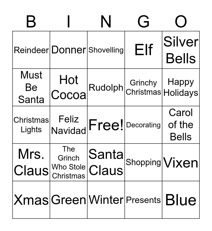 This bingo card has a free space and 64 words: Dasher, Dancer, Prancer, Vixen, Comet, Cupid, Donner, Blitzen, Rudolph, Frosty the Snowman, Santa Claus, Jingle Bells, Carol of the Bells, Silver Bells, Hark the Herald, Must Be Santa, Feliz Navidad, Reindeer, North Pole, Grinchy Christmas, The Grinch Who Stole Christmas, Mrs. Claus, Elf, Santa’s Workshop, Let It Snow!, All I Want For Christmas, A Few of My Favorite Things, The Nutcracker, 2018, December 25th, Joy To The World, Elf on a Shelf, Divinity, Christmas Tree, Happy Holidays, Xmas, Gifts, Presents, Toys, Hot Cocoa, Christmas Lights, Decorating, Blue, Green, Holiday Fun, Blue, Green, Holiday Fun, Shopping, Christmas Day, Christmas Eve, The Twelve Days of Christmas, Winter, Snow, Snowball, Snow Days, Shovelling, A Hot Savannah Christmas, Christmas Around the World, Rockin’ Around the Christmas Tree, White Christmas, The Sugar Plum Fairy, Hanging all the Lights and Sleigh Ride.