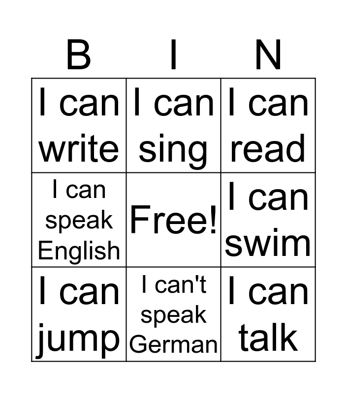 This bingo card has a free space and 8 words: I can swim, I can read, I can sing, I can jump, I can write, I can talk, I can speak English and I can't speak German.