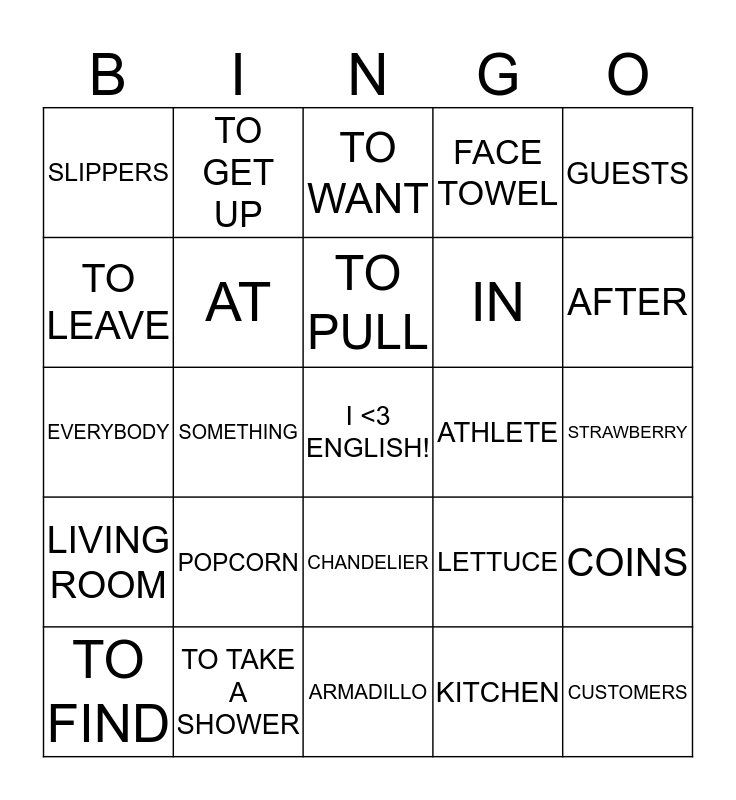 This bingo card has a free space and 60 words: BATHROOM, TO TAKE A SHOWER, BEDROOM, LIVING ROOM, KITCHEN, FOR, AT, ON, IN, NEIGHBOR, FACE TOWEL, TO LIVE, TO LEAVE, CAR, HOUSE, SLIPPERS, CUSTOMERS, GUESTS, TO PUSH, TO PULL, ATHLETE, TO WANT, TO FIND, COINS, MANY, MUCH, A LOT OF, TWICE, AFTER, BEFORE, DOWNTOWN, USUALLY, TO LEARN, TO TEACH, TO GET UP, TO TAKE CARE OF, SUNGLASSES, SOMETHING, TO OWN, EVERYBODY, TO WRITE, POPCORN, STRAWBERRY, MEAT, LETTUCE, BATHTUB, LAMP, VERANDA, BED, CHANDELIER, ARMADILLO, ERASER, DICTIONARY, WATERFALL, TO FINISH, TO DELAY, TO BURN, MACARONI, NAPKIN and WALLET.
