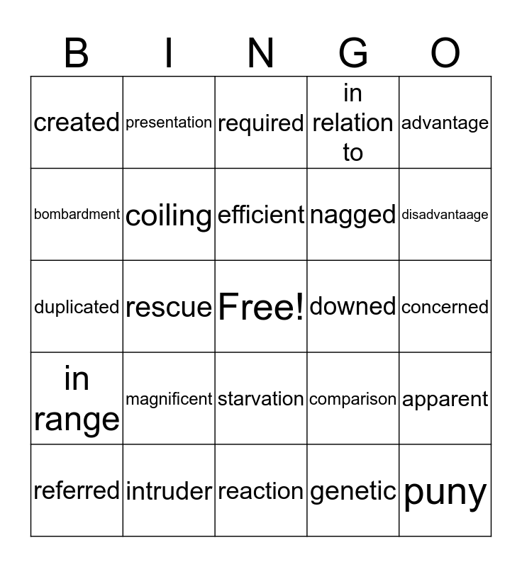 This bingo card has a free space and 36 words: trance, venom, aggressive, coiling, comparison, in range, efficient, instantly, advantage, determined, rescue, in relation to, particularly, downed, disadvantaage, created, filtering, magnificent, puny, required, concerned, apparent, intruder, referred, reaction, presentation, duplicated, coincidence, nagged, bombardment, ancient, nutrition, genetic, starvation, plentiful and diet.