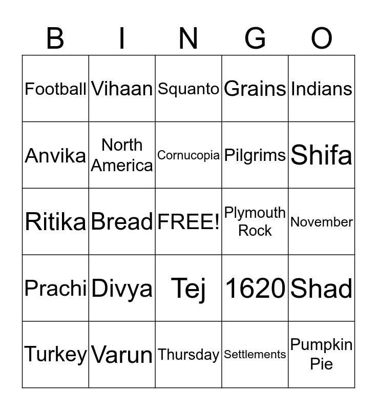 This bingo card has a free space and 55 words: Holiday, Turkey, Gravy, Football, Thursday, Colonies, North America, Mashed Potatoes, Pilgrims, Harvest, Grains, Hunting, Pumpkins, Cranberries, Corn, Cod, Indians, Bread, Parade, Pumpkin Pie, Plymouth Rock, Mayflower, 1620, Squanto, Macys, Cornucopia, Settlements, Massachusetts, November, Shad, Shaz, Prarthana, Deeksha, Arnav, Anvika, Ritika, Anirudh, Prachi, Ruhan, Trisha, Vihaan, Iha, Mirra, Mayur, Divya, Varun, Yogi, Jaya, Ayesha, Shifa, Amir, Rayan, Rohan, Tej and Mehak.