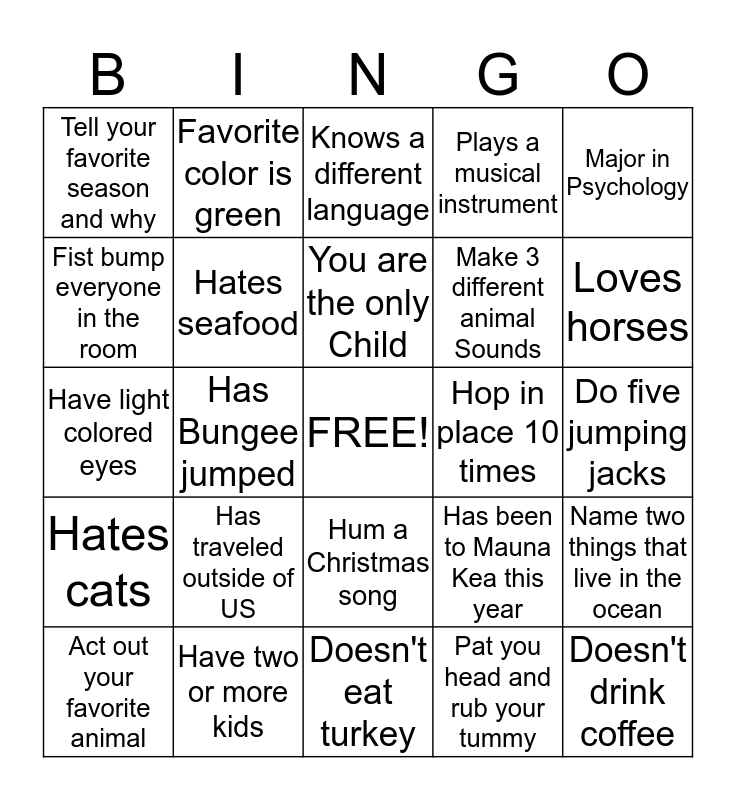 This bingo card has a free space and 24 words: Has traveled outside of US, Have two or more kids, You are the only Child, Act out your favorite animal, Major in Psychology, Tell your favorite season and why, Fist bump everyone in the room, Favorite color is green, Hop in place 10 times, Hum a Christmas song, Make 3 different animal Sounds, Have light colored eyes, Has been to Mauna Kea this year, Name two things that live in the ocean, Hates seafood, Pat you head and rub your tummy, Do five jumping jacks, Knows a different language, Loves horses, Has Bungee jumped, Doesn't drink coffee, Hates cats, Plays a musical instrument and Doesn't eat turkey.