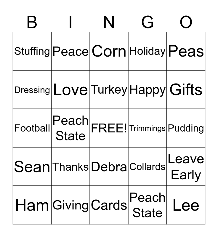 This bingo card has a free space and 24 words: Thanks, Giving, Turkey, Ham, Peas, Stuffing, Dressing, Peace, Trimmings, Debra, Happy, Football, Collards, Leave Early, Love, Peach State, Pudding, Corn, Gifts, Peach State, Lee, Sean, Holiday and Cards.