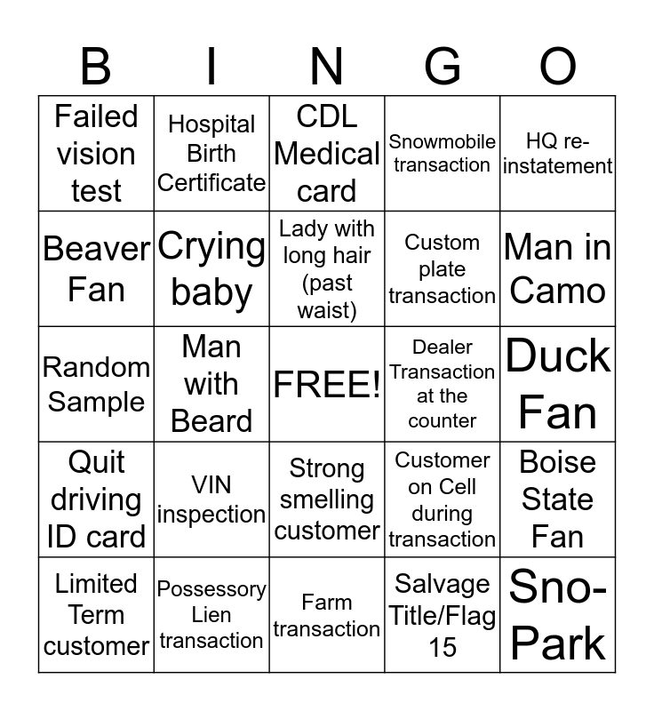This bingo card has a free space and 24 words: VIN inspection, Possessory Lien transaction, Lady with long hair (past waist), Limited Term customer, HQ re-instatement, Failed vision test, Beaver Fan, Hospital Birth Certificate, Dealer Transaction at the counter, Strong smelling customer, Custom plate transaction, Random Sample, Customer on Cell during transaction, Boise State Fan, Crying baby, Salvage Title/Flag 15, Duck Fan, CDL Medical card, Man in Camo, Man with Beard, Sno-Park, Quit driving ID card, Snowmobile transaction and Farm transaction.