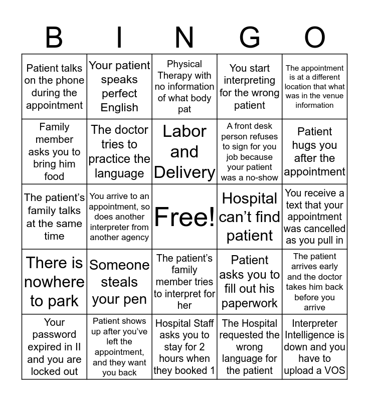 This bingo card has a free space and 24 words: Someone steals your pen, Patient shows up after you’ve left the appointment, and they want you back, Labor and Delivery, Your password expired in II and you are locked out, The appointment is at a different location that what was in the venue information, Patient talks on the phone during the appointment, Family member asks you to bring him food, Your patient speaks perfect English, Hospital can’t find patient, The patient’s family member tries to interpret for her, A front desk person refuses to sign for you job because your patient was a no-show, The patient’s family talks at the same time, Patient asks you to fill out his paperwork, The patient arrives early and the doctor takes him back before you arrive, The doctor tries to practice the language, The Hospital requested the wrong language for the patient, You receive a text that your appointment was cancelled as you pull in, Physical Therapy with no information of what body pat, Patient hugs you after the appointment, You arrive to an appointment, so does another interpreter from another agency, Interpreter Intelligence is down and you have to upload a VOS, There is nowhere to park, You start interpreting for the wrong patient and Hospital Staff asks you to stay for 2 hours when they booked 1.
