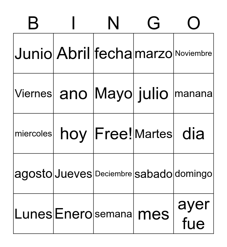 This bingo card has a free space and 24 words: Jueves, Enero, Mayo, Lunes, Noviembre, Junio, Viernes, Abril, Martes, Deciembre, julio, miercoles, sabado, domingo, ano, mes, dia, fecha, manana, hoy, ayer fue, agosto, marzo and semana.
