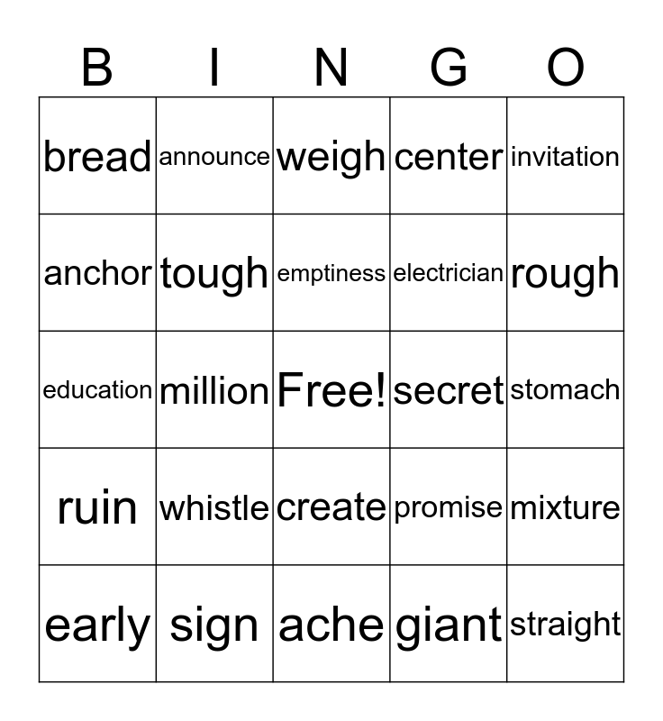 This bingo card has a free space and 29 words: early, field, million, Ms., bread, weigh, tough, whistle, secret, sign, stomach, straight, ache, giant, rough, echo, create, ruin, invitation, education, promise, magician, electrician, anchor, center, announce, mixture, emptiness and itchy.