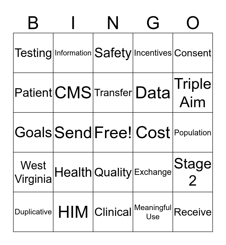 This bingo card has a free space and 24 words: Health, HIM, Transfer, Duplicative, Consent, Testing, Patient, Information, Cost, Quality, Data, Goals, Exchange, Stage 2, CMS, Meaningful Use, Population, Safety, Triple Aim, Send, Receive, West Virginia, Incentives and Clinical.