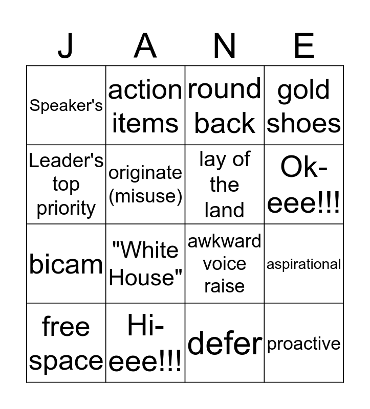 This bingo card has 16 words: Hi-eee!!!, aspirational, round back, Speaker's, bicam, action items, awkward voice raise, defer, Leader's top priority, originate (misuse), free space, gold shoes, "White House", Ok-eee!!!, lay of the land and proactive.