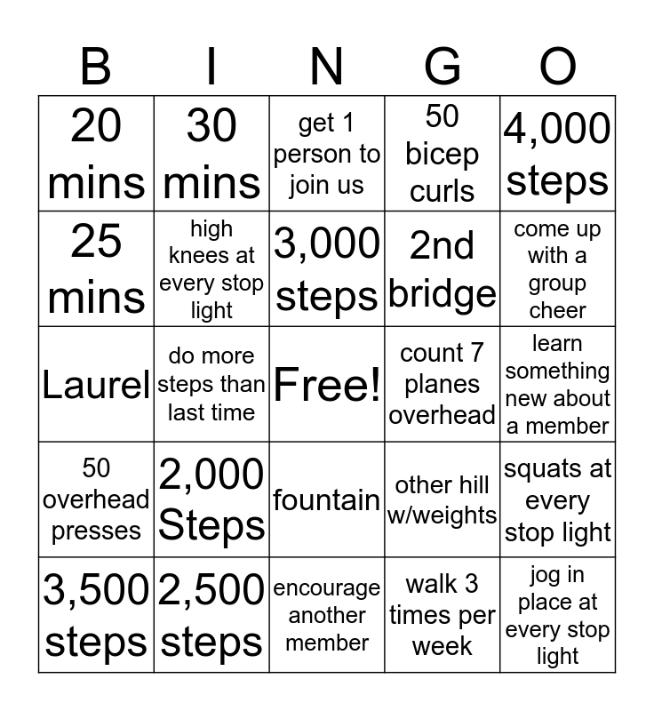 This bingo card has a free space and 24 words: 2,000 Steps, 2,500 steps, 3,000 steps, 3,500 steps, 4,000 steps, 20 mins, 25 mins, 30 mins, count 7 planes overhead, fountain, 2nd bridge, Laurel, other hill w/weights, squats at every stop light, high knees at every stop light, walk 3 times per week, learn something new about a member, get 1 person to join us, come up with a group cheer, do more steps than last time, jog in place at every stop light, 50 overhead presses, 50 bicep curls and encourage another member.