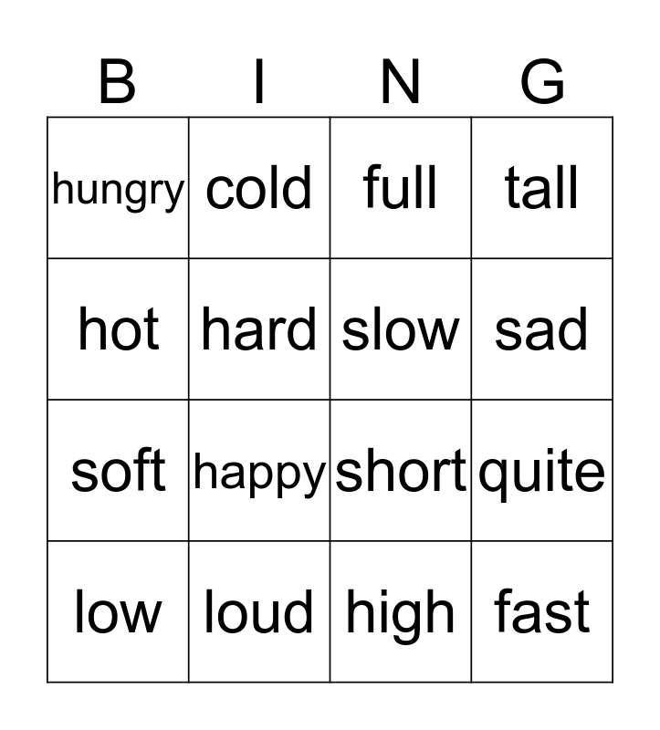 This bingo card has 16 words: loud, quite, full, hungry, soft, cold, short, high, hot, hard, low, tall, happy, sad, slow and fast.