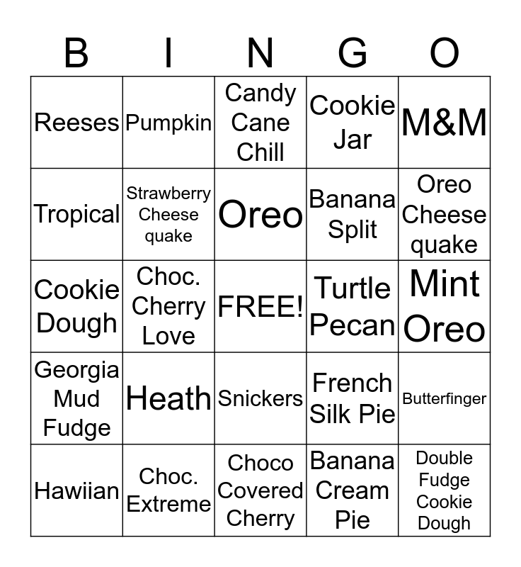 This bingo card has a free space and 24 words: Heath, Choc. Extreme, Oreo, Hawiian, M&M, Reeses, Tropical, Pumpkin, Turtle Pecan, Snickers, Banana Split, Cookie Dough, French Silk Pie, Butterfinger, Strawberry Cheese quake, Banana Cream Pie, Mint Oreo, Candy Cane Chill, Oreo Cheese quake, Choc. Cherry Love, Double Fudge Cookie Dough, Georgia Mud Fudge, Cookie Jar and Choco Covered Cherry.