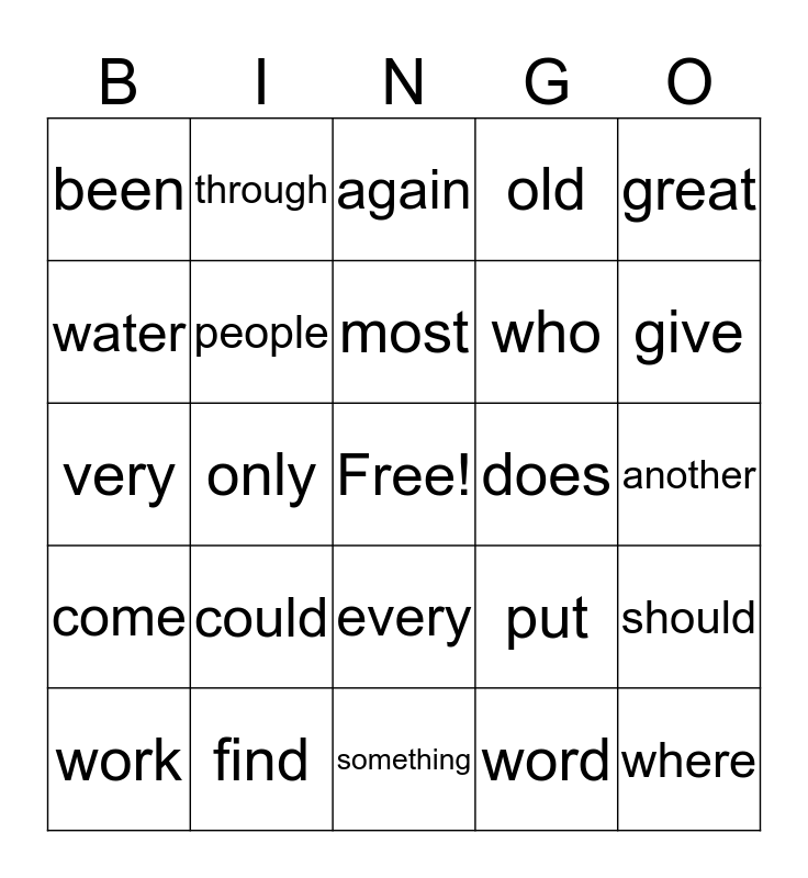 This bingo card has a free space and 24 words: could, find, most, work, great, been, water, through, does, every, who, very, put, should, people, word, another, again, give, only, where, come, old and something.