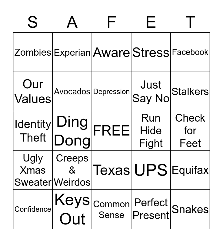 This bingo card has a free space and 40 words: Amazon, Identity Theft, Con Artist, Avocados, Keys Out, Texas, Depression, Grinch, Facebook, Ugly Xmas Sweater, Ding Dong, Stress, Snakes, Check for Feet, Run Hide Fight, Creeps & Weirdos, Say Something, Zombies, Lighting, Aware, Equifax, Perfect Present, Just Say No, Our Values, Wal-Mart, Take It! Give it Up, TransUnion, Baby Goats, Get Organized, Escort, Scammers, Confidence, Eye Contact, UPS, Stalkers, Common Sense, Trust Instincts, Homeless Snakes, Experian and Focus on Family.