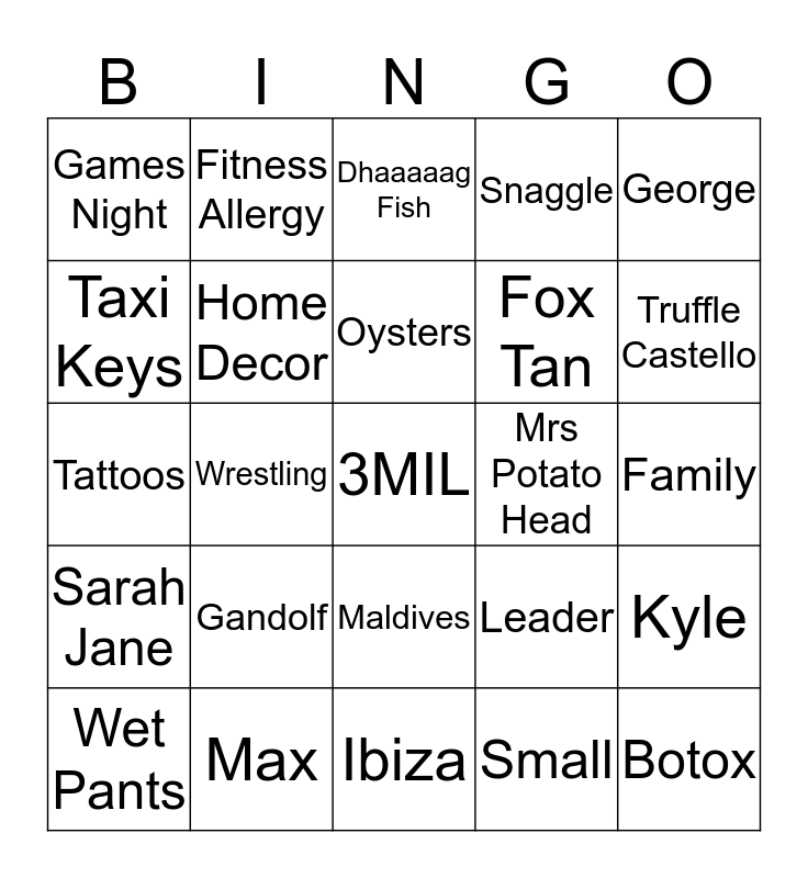 This bingo card has 45 words: Seven, 3MIL, 1MIL, Wet Pants, Scraped Knee, Small, Dhaaaaag Fish, Harry, George, Max, Snaggle, Mrs Potato Head, Maldives, Gandolf, Devils Ivy, Ibiza, Arrested, Tattoos, Demons, Truffle Castello, Fitness Allergy, Hillarys, Wine, Games Night, Competitive, Family, Beer Pong, Sunbathing, Leader, Sarah Jane, Phillips, Kyle, The Block, Hillarys, Social, Wrestling, Mustard Yellow, Lyndal, Botox, Oysters, Taxi Keys, Fox Tan, Online Shopping, Home Decor and Poppet.