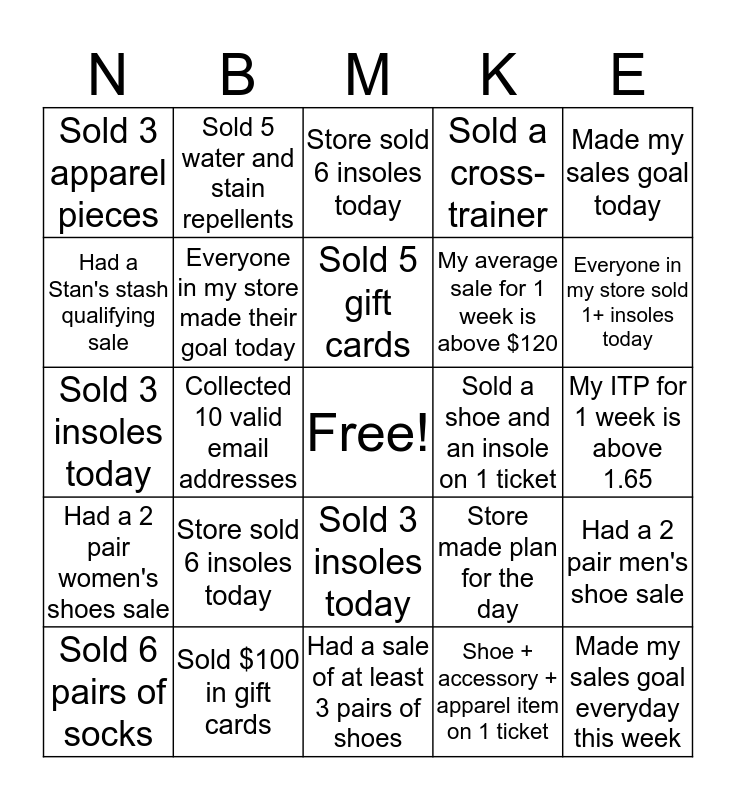 This bingo card has a free space and 24 words: Store sold 6 insoles today, Sold $100 in gift cards, Sold 5 gift cards, Sold 6 pairs of socks, Made my sales goal today, Sold 3 apparel pieces, Had a Stan's stash qualifying sale, Sold 5 water and stain repellents, Sold a shoe and an insole on 1 ticket, Sold 3 insoles today, My average sale for 1 week is above $120, Sold 3 insoles today, Store made plan for the day, Had a 2 pair men's shoe sale, Everyone in my store made their goal today, Shoe + accessory + apparel item on 1 ticket, My ITP for 1 week is above 1.65, Store sold 6 insoles today, Everyone in my store sold 1+ insoles today, Collected 10 valid email addresses, Made my sales goal everyday this week, Had a 2 pair women's shoes sale, Sold a cross-trainer and Had a sale of at least 3 pairs of shoes.