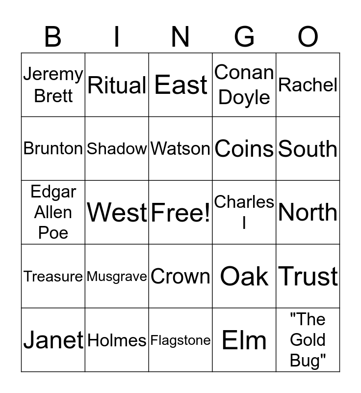 This bingo card has a free space and 24 words: Musgrave, Holmes, Watson, Janet, Rachel, Jeremy Brett, Brunton, Ritual, Charles I, Crown, Coins, Edgar Allen Poe, Oak, Trust, Shadow, Elm, North, East, South, West, "The Gold Bug", Treasure, Conan Doyle and Flagstone.