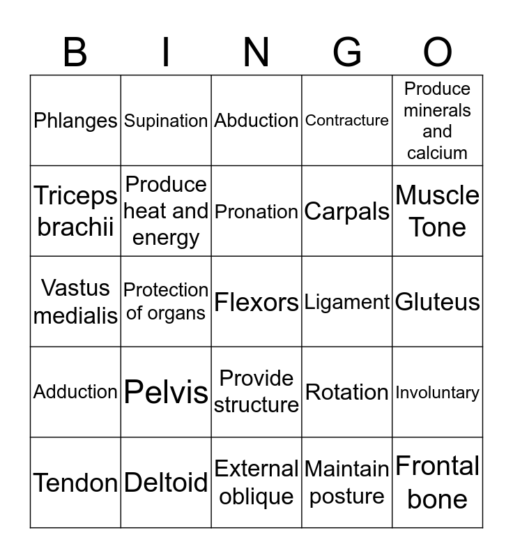This bingo card has 25 words: Pelvis, External oblique, Pronation, Tendon, Produce minerals and calcium, Phlanges, Triceps brachii, Supination, Ligament, Provide structure, Carpals, Vastus medialis, Rotation, Involuntary, Produce heat and energy, Frontal bone, Gluteus, Abduction, Muscle Tone, Protection of organs, Flexors, Deltoid, Adduction, Contracture and Maintain posture.